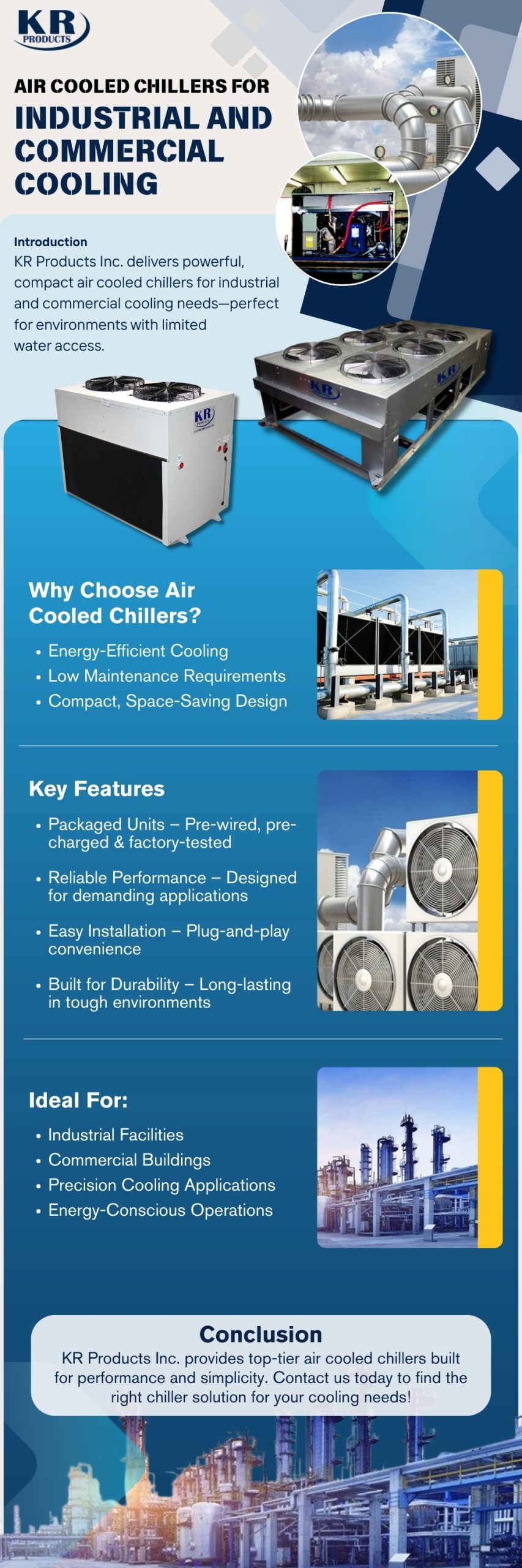 https://www.krproductsinc.com/ – KR Products Inc. delivers powerful, compact air cooled chillers for industrial and commercial cooling needs – perfect for environments with limited water access. KR Products Inc. provides top-tier air cooled chillers built for performance and simplicity. Contact us today to find the right chiller solution for your cooling needs!