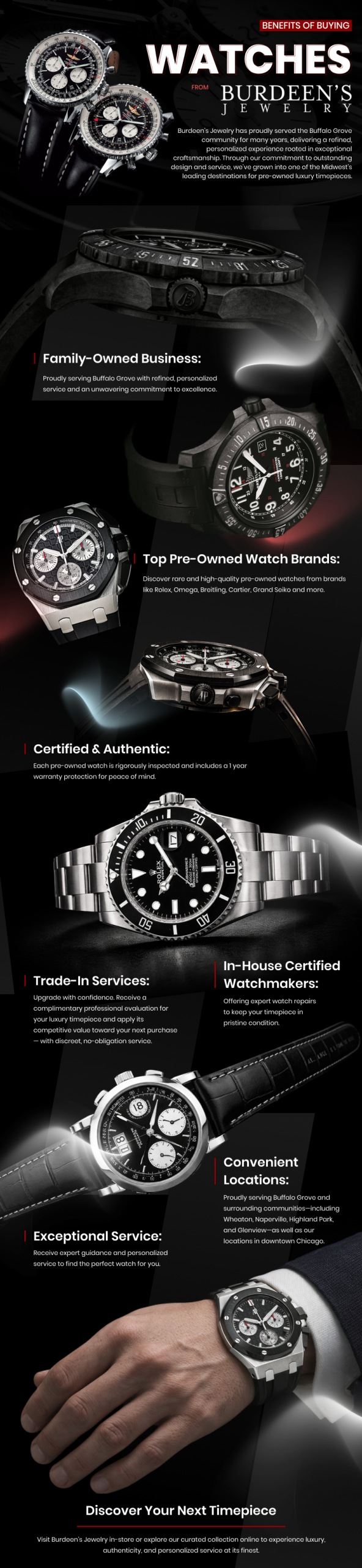 https://burdeens.com/pages/buffalo-grove : For many years, Burdeen’s Jewelry has proudly served the Buffalo Grove community and beyond, delivering a refined, personalized experience rooted in exceptional craftsmanship. As a family-owned business, we combine decades of expertise with a commitment to outstanding design and service, establishing ourselves as one of the Midwest’s premier destinations for luxury fine jewelry and pre-owned timepieces. Whether you are seeking a rare Rolex, Omega, Breitling, Cartier, or Grand Seiko, our curated collection offers unparalleled quality and authenticity. Every pre-owned watch we sell undergoes a rigorous inspection by our in-house certified watchmakers and includes a one-year warranty, ensuring your peace of mind. Beyond our extensive watch inventory, we provide expert trade-in services with complimentary, no-obligation evaluations, as well as comprehensive repair services to keep your timepieces in pristine condition. We invite you to visit us at our Buffalo Grove headquarters or our downtown Chicago boutiques, where our team provides expert guidance to help you find the perfect piece. Discover luxury, authenticity, and personalized service at its finest—visit Burdeen’s Jewelry in-store or explore our collection online at Burdeens.com.