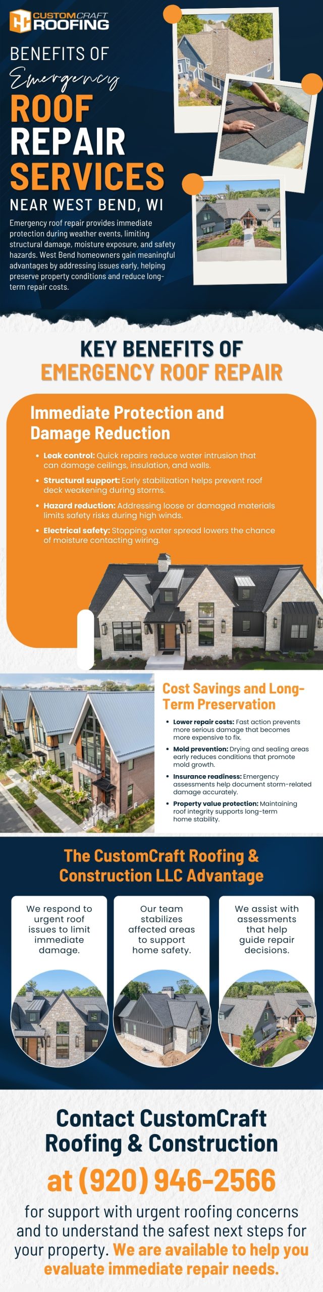 https://customcraftroofing.com/roofing-contractor-west-bend-wi/ Emergency roof repair services protect West Bend, WI homeowners from structural damage, moisture intrusion, and safety hazards during severe weather. Acting quickly reduces long-term repair costs, prevents mold growth, and preserves property value. CustomCraft Roofing & Construction LLC provides prompt response, damage stabilization, and accurate assessments. Call (920) 946-2566 for urgent roofing support today.