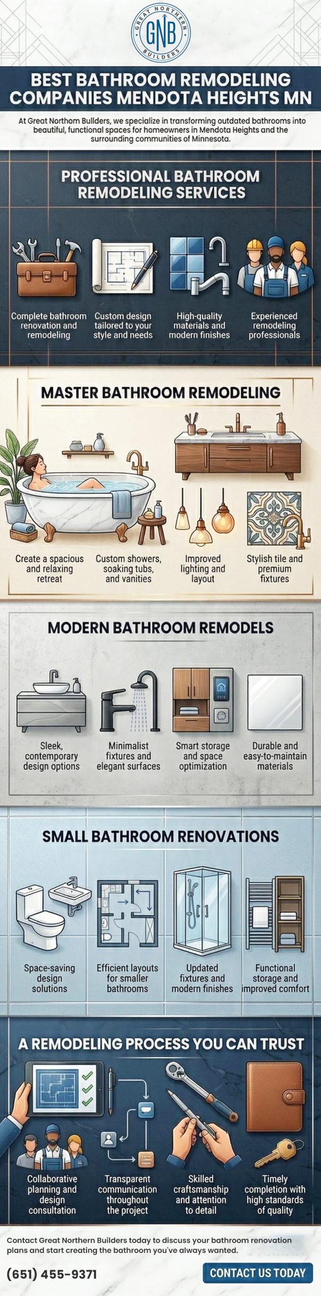 https://gnbmn.com/bathroom-remodeling-and-renovation-mendota-heights-mn/ – At Great Northern Builders, we specialize in transforming outdated bathrooms into beautiful, functional spaces for homeowners in Mendota Heights and the surrounding communities of Minnesota. Contact us today to discuss your bathroom renovation plans and start creating the bathroom you’ve always wanted.
