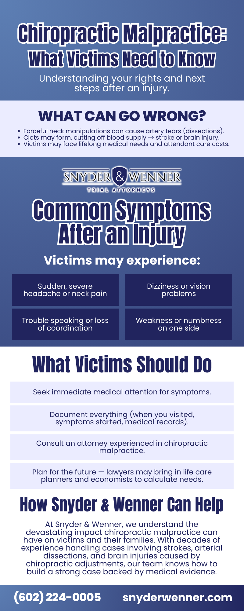 https://snyderwenner.com/medical-malpractice-arizona/chiropractic-malpractice/ – When chiropractic care goes wrong, the consequences can be devastating. Forceful neck manipulations may cause artery tears, strokes, or brain injuries, leaving victims with lifelong challenges. Common symptoms include sudden neck pain, dizziness, and weakness. The experienced chiropractic malpractice attorneys at Snyder & Wenner help victims document injuries, work with medical experts, and recover full compensation for ongoing care. If you or a loved one was harmed by negligent chiropractic treatment, call (602) 224-0005 or visit snyderwenner.com to discuss your legal options today.