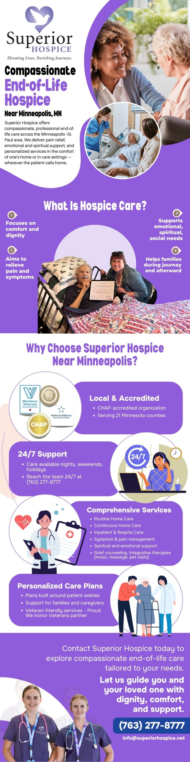 https://superiorhospice.net/ – At Superior Hospice we provide compassionate end-of-life care across Minneapolis, focusing on comfort, dignity, and support. Our accredited team offers 24/7 assistance, personalized care plans, pain and symptom relief, and emotional guidance to help patients and families navigate this journey with peace.