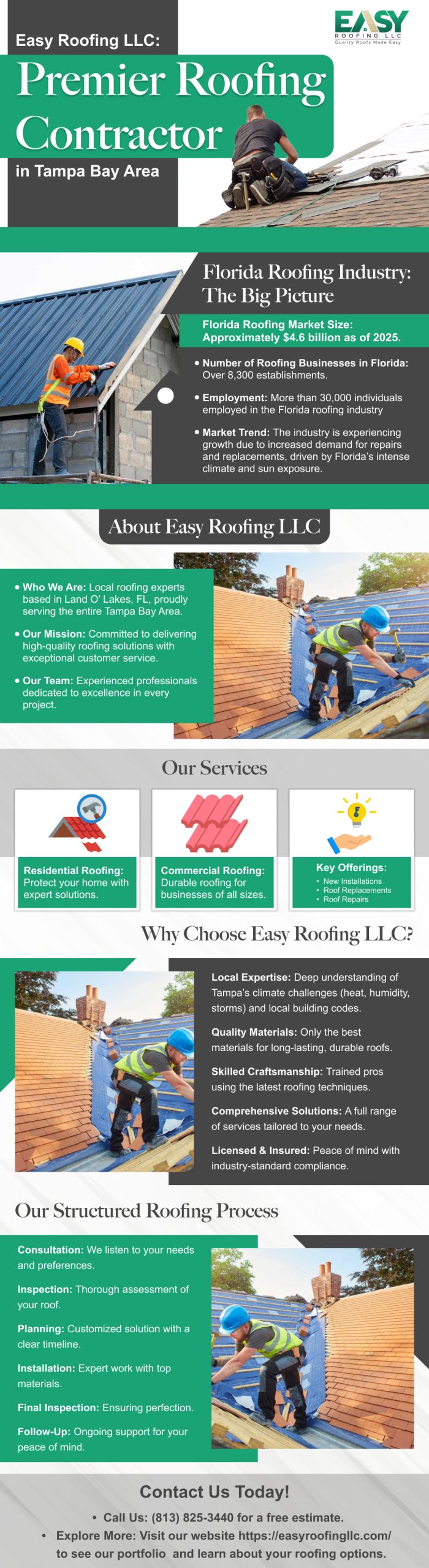 Florida’s $4.6B roofing industry is growing rapidly, driven by the state’s intense climate. Easy Roofing LLC in Land O’ Lakes proudly serves the Tampa Bay Area with expert residential and commercial roofing services. Our licensed team delivers quality craftsmanship, durable materials, and tailored solutions built to last.