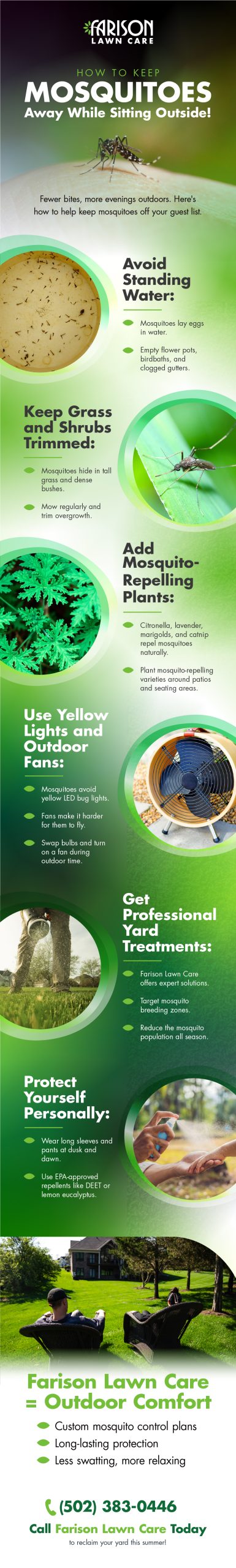 https://farison.com/program/mosquito-control-program/ – Enjoy your time outside without the hassle of mosquitoes! To keep these pests away, start by avoiding standing water where mosquitoes lay their eggs, such as in flower pots, birdbaths, or clogged gutters. Trim tall grass and dense bushes to eliminate hiding spots. Plant mosquito-repelling plants like citronella and lavender around seating areas. Use yellow LED lights and outdoor fans to make it harder for mosquitoes to fly. For long-lasting results, consider professional yard treatments from Farison Lawn Care. Click the infographic to find out more today!