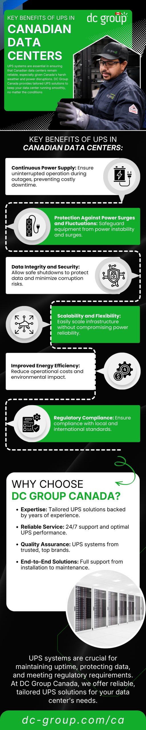 https://www.dc-group.com/ca/data-centers-ups-solutions/: In the demanding landscape of Canadian infrastructure, UPS systems serve as the essential backbone of data center reliability, providing a critical buffer against the nation’s extreme weather patterns and unpredictable power disruptions. DC Group Canada specializes in delivering tailored UPS solutions that ensure a continuous power supply to eliminate costly downtime while safeguarding sensitive hardware from damaging surges and fluctuations. Beyond physical protection, these systems are vital for maintaining data integrity through safe shutdowns, offering the scalability and flexibility needed to grow infrastructure without compromising consistency. Modern UPS units also enhance energy efficiency to reduce operational costs and ensure strict regulatory compliance with both local and international standards. By choosing DC Group Canada, you gain access to industry-leading expertise, 24/7 reliable service, and end-to-end support—from the installation of top-tier brands to ongoing maintenance—guaranteeing that your data center remains secure, efficient, and always online.