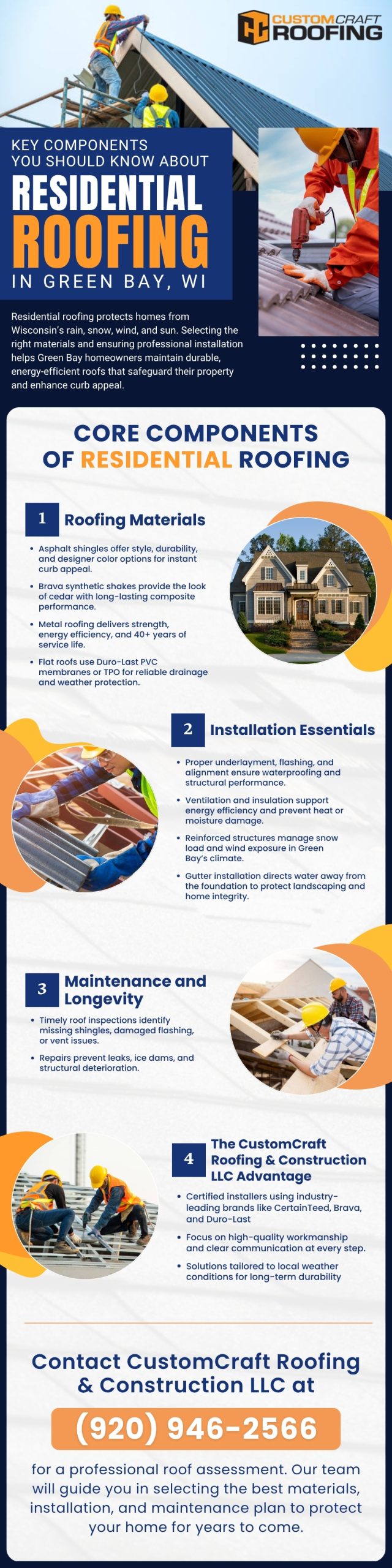 https://customcraftroofing.com/roofing-contractor-green-bay-wi/ Residential roofing in Green Bay, WI, protects homes from harsh weather while improving energy efficiency and curb appeal. This infographic outlines key components, including roofing materials, proper installation techniques, and essential maintenance practices to ensure long-lasting performance and durability.