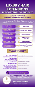 Bravo Salon AZ offers luxury hair extensions in Scottsdale and Phoenix with options for added length, volume, dimension, and a seamless blend. Services include tape-in extensions, hand-tied wefts, keratin bond extensions, beaded I-tip and flat tip methods, halo and clip-ins, hair toppers, and premium Hairdreams systems. Every service features 100% human hair and expert color matching for a natural finish. Book a hair extension consultation to find the best method for your hair type and lifestyle.