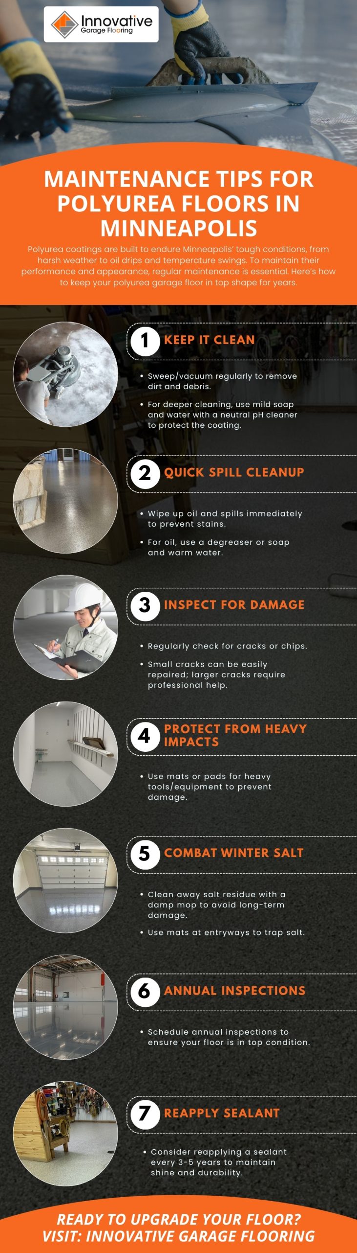 https://www.innovativegarageflooring.com/epoxy-flooring/polyurea-epoxy-flooring/: To keep your polyurea garage floor in top condition, especially in the harsh Minneapolis weather, regular maintenance is crucial. Start by keeping it clean β sweep or vacuum frequently to remove dirt and debris. For deeper cleaning, use mild soap and water with a neutral pH cleaner to protect the coating. When spills occur, especially oil, clean them up immediately to prevent staining. Use a degreaser or soap with warm water for oil spills. Itβs also important to regularly inspect your floor for cracks or chips. Small cracks can be repaired easily, but larger issues may require professional help.