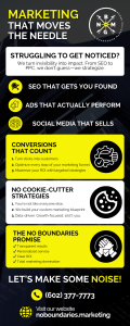 No Boundaries Marketing Group specializes in driving impactful results through strategic marketing. From effective SEO to high-performing ads and social media strategies, we optimize every step of your marketing funnel to convert clicks into customers and maximize ROI. We provide custom, data-driven marketing solutions that cater to your unique business needs. Say goodbye to cookie-cutter strategies and hello to marketing that truly moves the needle. Ready to dominate your market? Let’s make some noise!