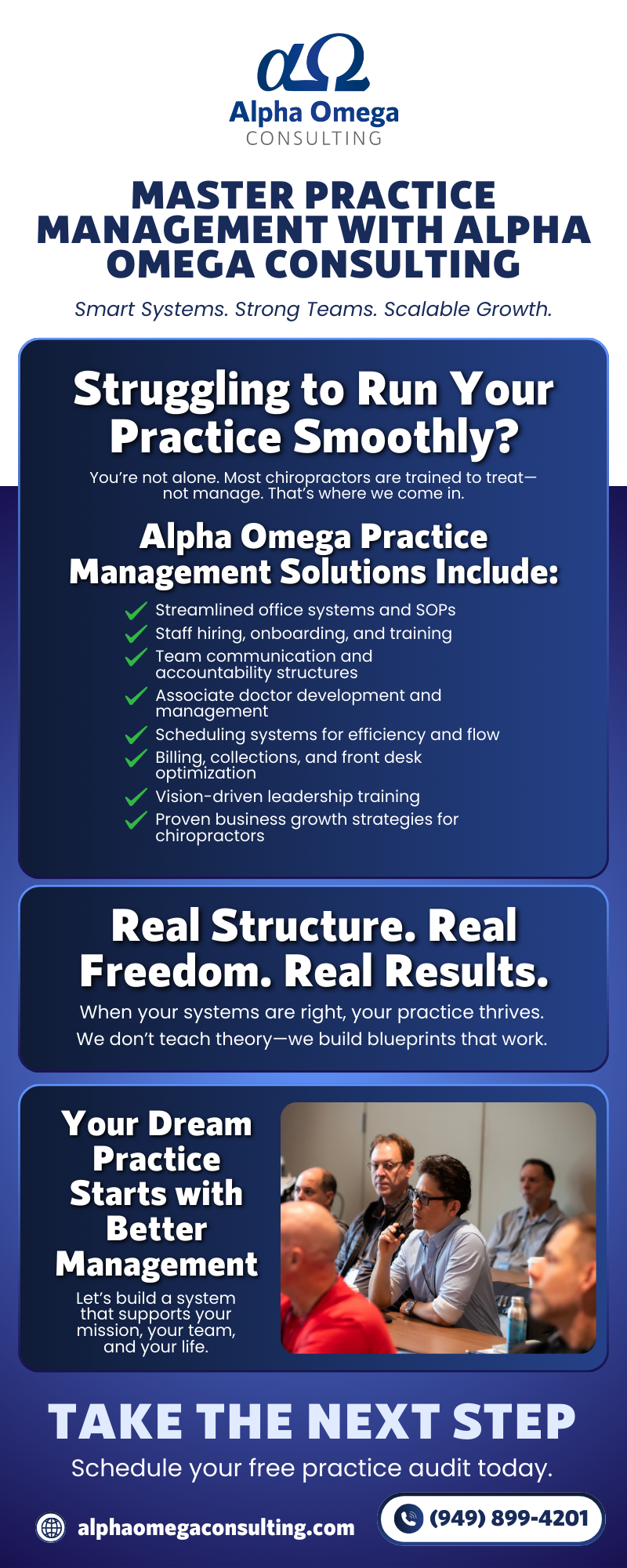 https://www.alphaomegaconsulting.com/chiropractic-group-coaching/ – Alpha Omega Consulting helps chiropractors master practice management through smart systems, strong teams, and scalable growth. We provide hands-on solutions for staffing, operations, scheduling, billing, and leadership—so your practice runs smoothly without constant stress. Our proven frameworks replace chaos with clarity, helping you build accountability, efficiency, and sustainable success. When your systems support your vision, you gain more freedom, better performance, and a practice that truly works for you.