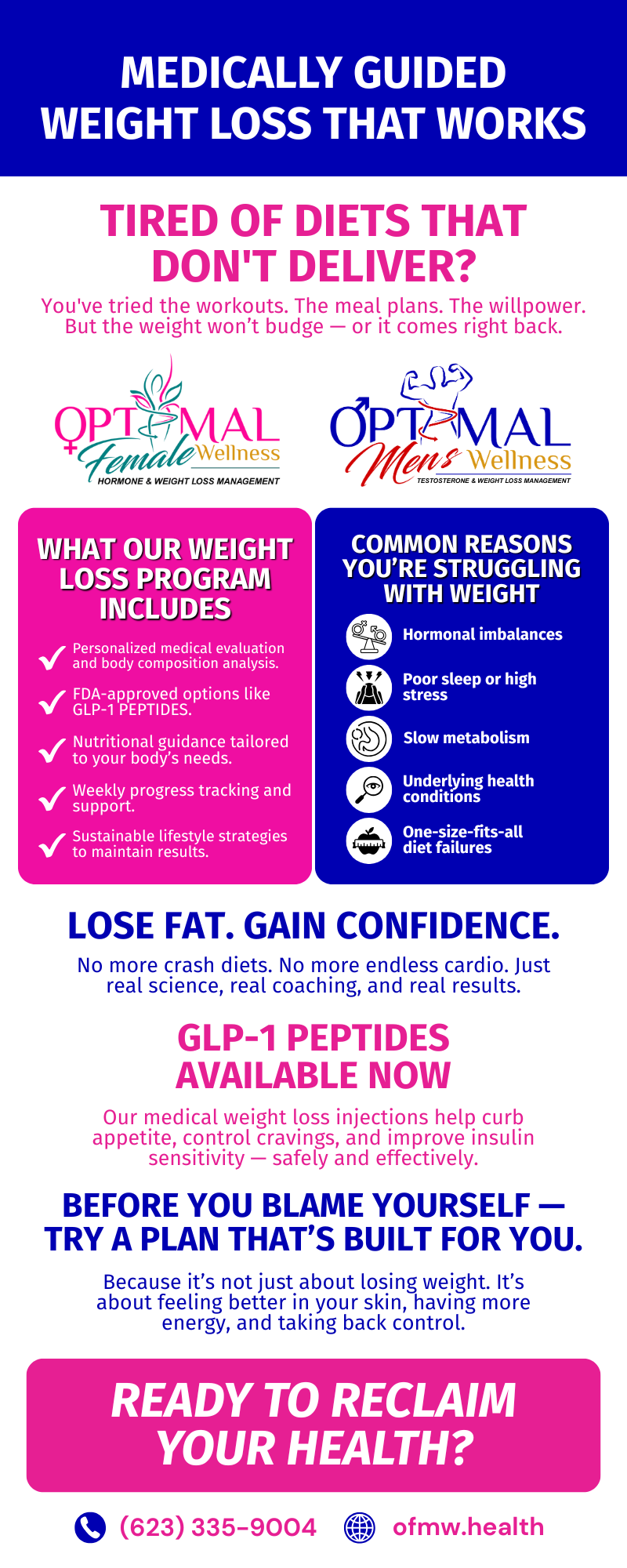 https://ofmw.health/what-we-do/glp-1-weight-loss-treatment/ – At Optimal Female and Men’s Wellness (OFMW), we offer a medically guided weight loss program designed to help you shed fat and regain confidence safely and effectively. If traditional diets and workouts haven’t worked, our customized approach addresses the real causes of weight struggles—hormonal imbalances, poor sleep, stress, or slow metabolism. We combine FDA-approved GLP-1 peptide treatments, nutritional guidance, and ongoing medical support to help you achieve lasting results. No crash diets or one-size-fits-all plans—just real science and sustainable progress. Take control of your health today. Call (623) 335-9004 or visit ofmw.health to begin your journey.