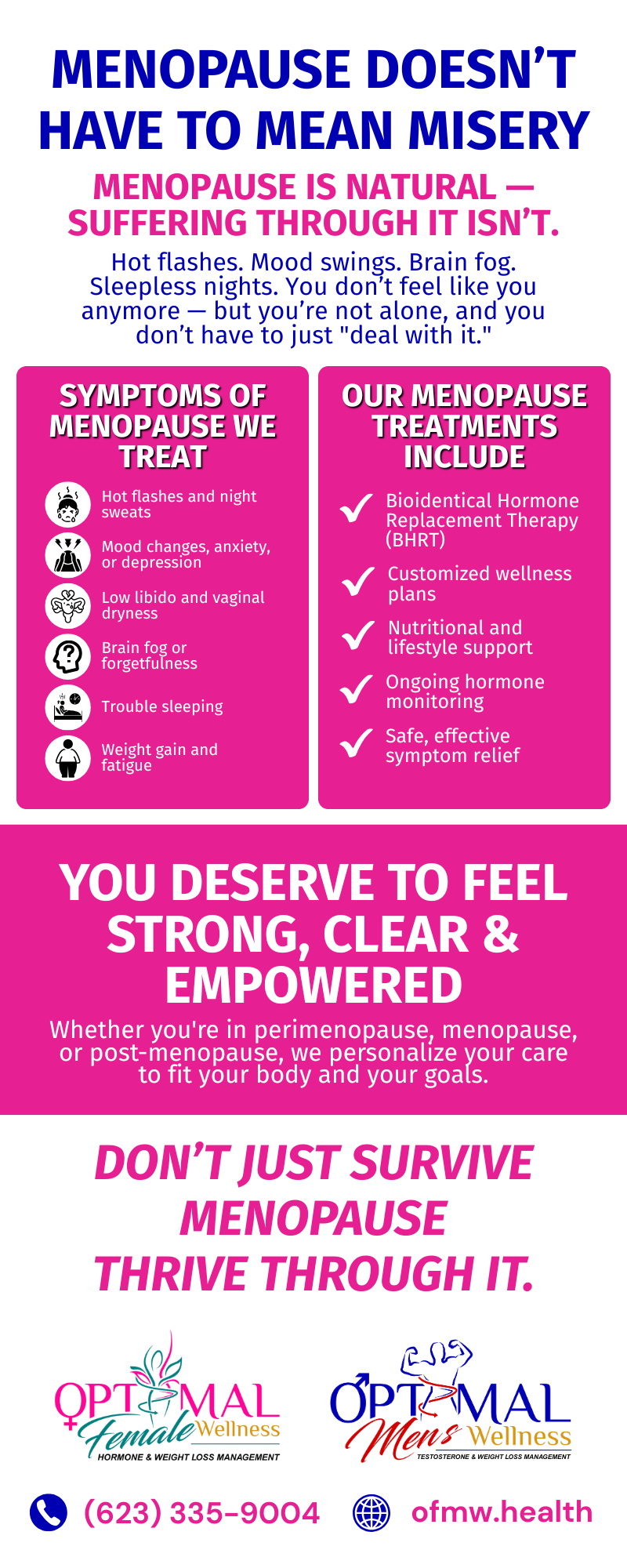 https://ofmw.health/what-we-do/menopause/ – At Optimal Female Wellness, we offer personalized menopause treatments to help you thrive through this natural life stage. Our services target common symptoms like hot flashes, mood swings, brain fog, and trouble sleeping, offering relief through Bioidentical Hormone Replacement Therapy (BHRT), customized wellness plans, nutritional and lifestyle support, and ongoing hormone monitoring. Whether you’re experiencing perimenopause, menopause, or post-menopause, we tailor our care to meet your needs and help you feel strong, clear, and empowered. Don’t just survive menopause—thrive through it with our expert care. Reach out at (623) 335-9004 or visit ofmw.health to learn more.