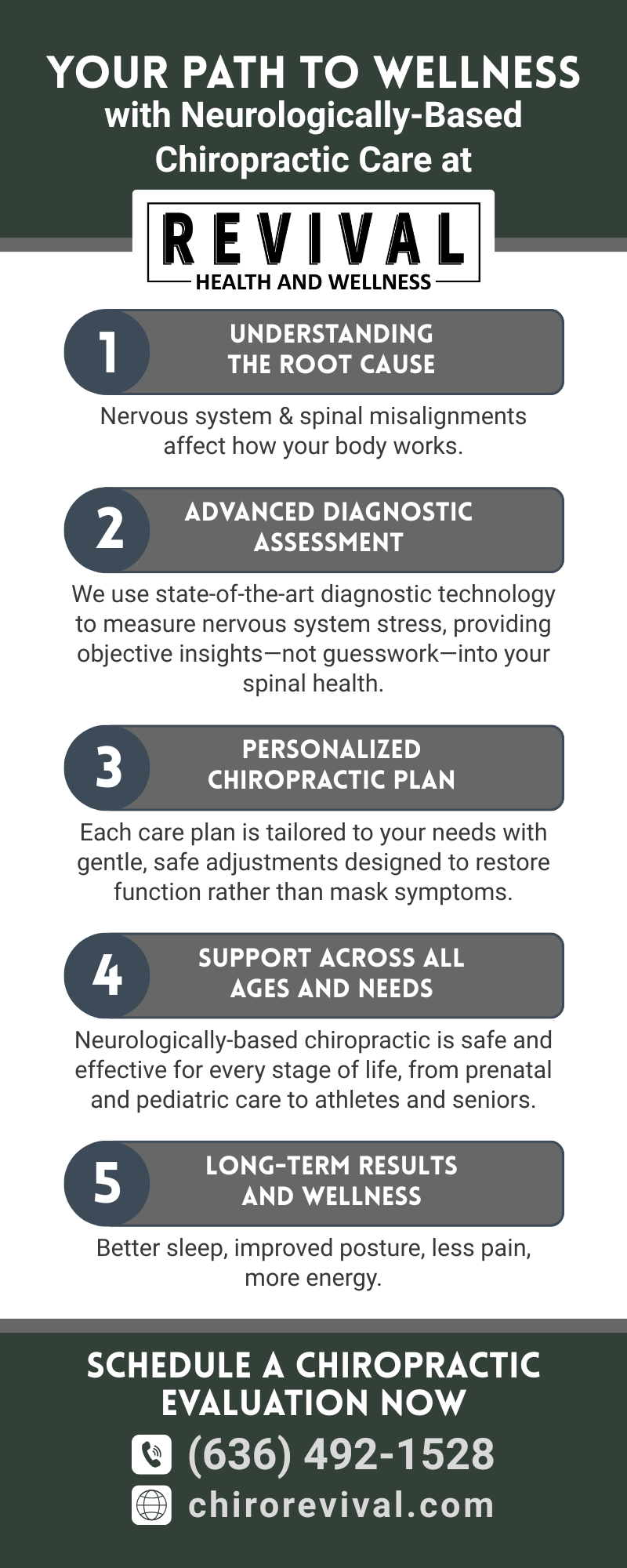 https://chirorevival.com/chiropractic-care-services-in-arnold-mo/ – Discover your path to wellness with neurologically based chiropractic care at Revival Health & Wellness in Arnold, MO. Our advanced diagnostic technology helps identify nervous system and spinal misalignments, providing clear insights into your health. We create personalized care plans with gentle, safe adjustments aimed at restoring function, not just masking symptoms. Effective for all ages and needs, from prenatal and pediatric care to athletes and seniors, our treatments improve sleep and posture, reduce pain, and increase energy. Schedule your chiropractic evaluation today! Call 636-492-1528 or visit chirorevival.com.