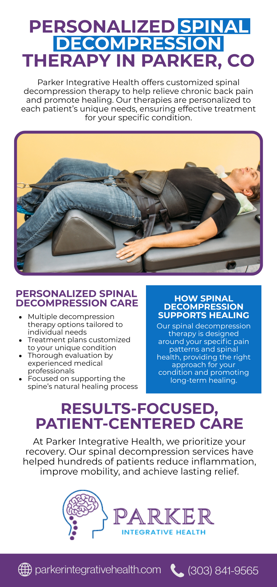https://www.parkerintegrativehealth.com/services/spinal-decompression/ – Parker Integrative Health provides customized spinal decompression therapy in Parker and Lone Tree, CO, to help relieve chronic back pain, improve mobility, and support natural healing. Our patient-centered approach also offers targeted decompression therapy for athletes seeking faster recovery and lasting performance support.