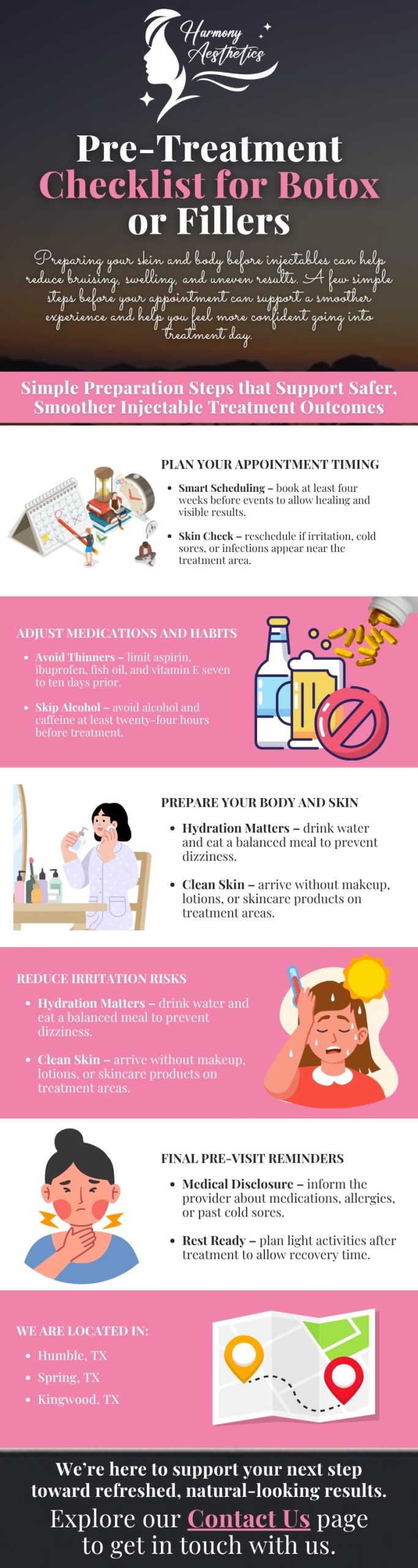https://harmonyaestheticsspa.com/ – Prepare for Botox or dermal fillers with a complete pre-treatment checklist designed to reduce bruising, swelling, and uneven results. Discover the best time to schedule your appointment, which medications and habits to avoid, and how to properly hydrate and care for your skin beforehand. This guide also highlights ways to minimize irritation and important pre-visit reminders, helping you feel confident, prepared, and ready for smoother, natural-looking results in Humble, Spring, and Kingwood, TX.