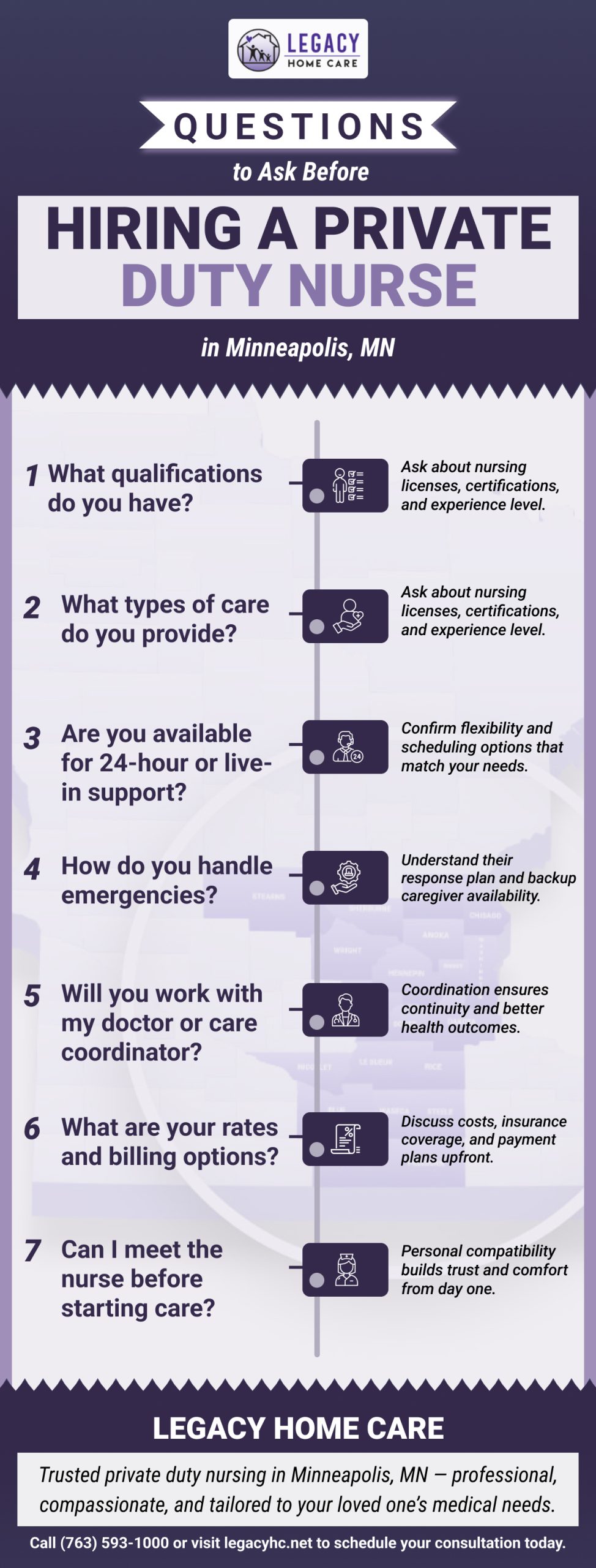 https://legacyhc.net/about-us/area-we-serve/home-care-in-hennepin-county/private-duty-nursing-in-minneapolis/ – Legacy Home Care offers trusted private duty nursing in Minneapolis, MN, providing professional, compassionate care tailored to your loved one’s medical needs. When choosing a caregiver, ask about their qualifications, including nursing licenses, certifications, and experience. Clarify the types of care provided, from medical to personal or specialized needs, and confirm availability for 24-hour or live-in support. Understand their emergency protocols and coordination with your doctor or care coordinator. Discuss rates, billing options, and insurance coverage upfront, and ask to meet the nurse before care begins to ensure compatibility. Call (763) 593-1000 or visit legacyhc.net to schedule your consultation today.
