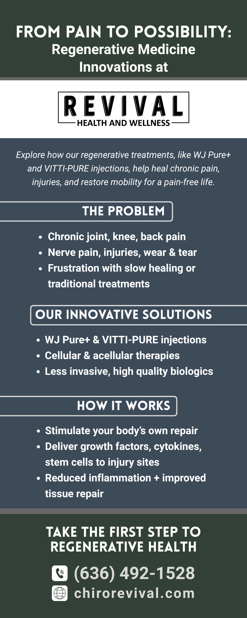https://chirorevival.com/chiropractic-care-services-in-arnold-mo/ – Experience innovative regenerative medicine treatments at Revival Health & Wellness in Arnold, MO, designed to heal chronic pain and restore mobility. Our advanced solutions, including WJ Pure+ and VITTI-PURE injections, target knee, joint, back, and nerve pain with minimal invasiveness. These cellular and acellular therapies deliver growth factors, cytokines, and stem cells to injury sites, reducing inflammation and promoting tissue repair. If you’re frustrated with slow healing or traditional treatments, it’s time to explore a pain-free life. Take the first step toward regenerative health—call 636-492-1528 or visit chirorevival.com.