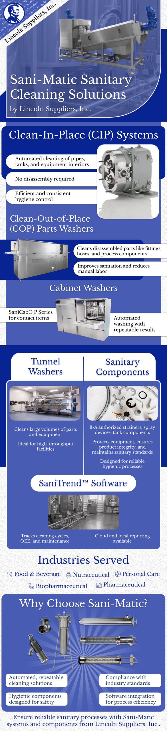 https://lincolnsuppliers.com/pumps/sanimatic-pumps/ – Discover Sani-Matic sanitary cleaning solutions from Lincoln Suppliers, Inc., designed for efficient, automated hygiene control across critical industries. From Clean-In-Place (CIP) systems and Clean-Out-of-Place (COP) parts washers to cabinet and tunnel washers, Sani-Matic ensures consistent, high-performance cleaning. Enhance safety with 3-A authorized sanitary components and streamline operations using SaniTrend™ software for real-time tracking and reporting. Ideal for food, beverage, and pharmaceutical applications, Sani-Matic delivers reliable, compliant, and repeatable cleaning solutions that keep your processes running smoothly.