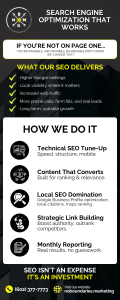 Boost your online visibility with No Boundaries Marketing Group’s proven SEO strategies. Our comprehensive approach delivers higher Google rankings, increased local visibility, more web traffic, and higher conversion rates. We specialize in technical SEO, content that converts, local SEO domination, strategic link building, and monthly reporting. If your business isn’t on page one, you’re invisible โ€“ and we can change that. Let us drive your business’s growth with effective, data-driven SEO. Contact us today to start investing in your SEO success.