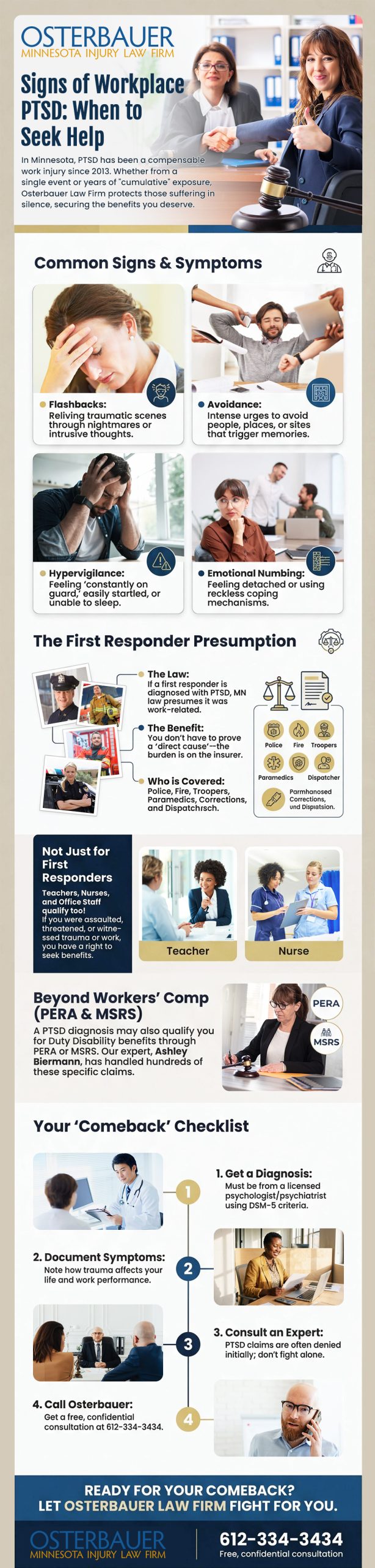 https://osterbauerlawfirm.com/ptsd-claims/: In Minnesota, PTSD has been recognized as a compensable work injury since 2013, and Osterbauer Law Firm helps individuals who are suffering in silence pursue the benefits they deserve. Whether PTSD results from a single traumatic incident or years of cumulative exposure, symptoms such as flashbacks, avoidance, hypervigilance, sleep disruption, emotional detachment, or reckless coping behaviors can have a serious impact on daily life and work performance. Minnesota law also provides a special presumption for first responders, including police officers, firefighters, state troopers, paramedics, corrections workers, and dispatchers, meaning a PTSD diagnosis is presumed to be work-related unless the insurer can prove otherwise. Workers outside those roles, such as teachers, nurses, and office staff, may also qualify if they were assaulted, threatened, or exposed to trauma on the job. In some cases, a PTSD diagnosis may also support Duty Disability benefits through PERA or MSRS. Because these claims are often denied at first, Osterbauer Law Firm encourages injured workers to seek a proper DSM-5 diagnosis, document how symptoms affect their life, and contact the firm at 612-334-3434 for a free, confidential consultation.