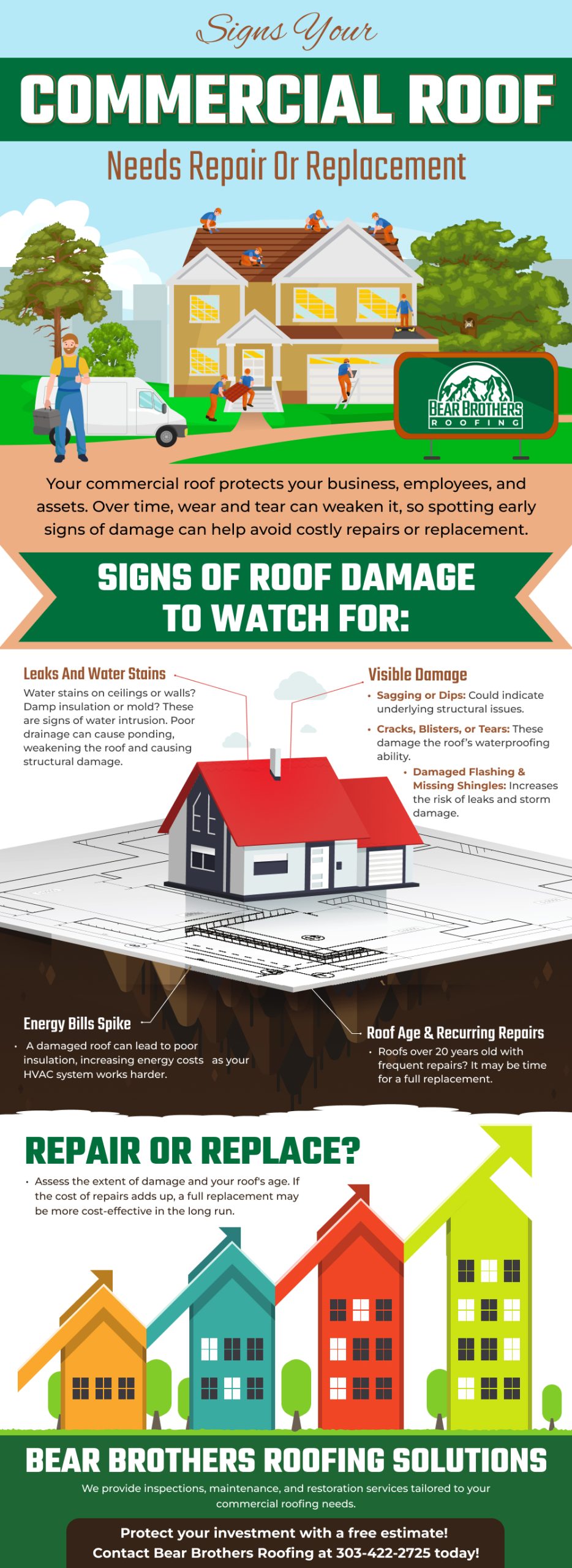 https://bearbrothersroofing.com/signs-your-commercial-roof-needs-repair-or-replacement/ – Protect your business with Bear Brothers Roofing—your trusted partner in commercial roof repair and replacement. Over time, leaks, water stains, sagging, or damaged flashing can signal serious roof issues that threaten your property and increase energy costs. If your roof is over 20 years old or needs frequent repairs, a full replacement may be more cost-effective. Our experts provide professional inspections, maintenance, and restoration services to extend your roof’s life. Call (303) 422-2725 or visit us for a free estimate and protect your investment today!