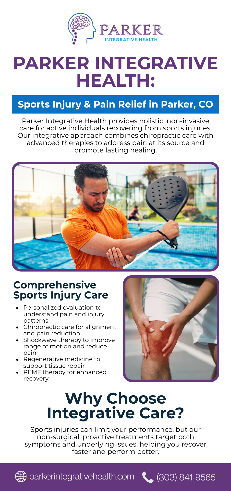 https://www.parkerintegrativehealth.com/ – Parker Integrative Health provides expert sports injury chiropractic care in Parker and Lone Tree, CO. Our integrative, non-surgical treatments help relieve pain, restore mobility, and support faster recovery by addressing the root cause of sports-related injuries.