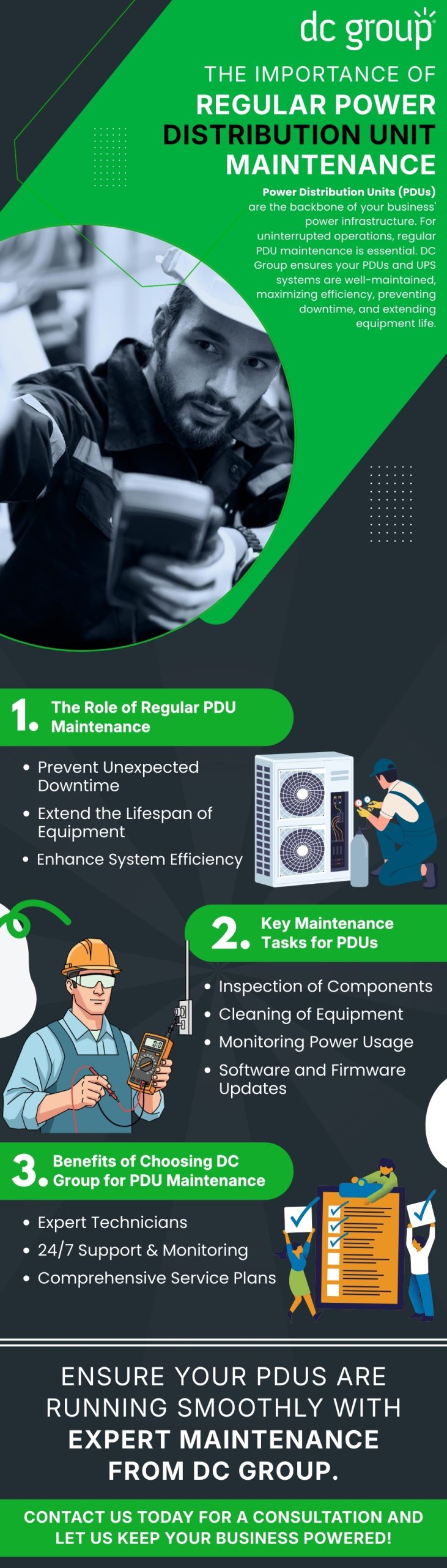https://www.dc-group.com/power-distribution-unit/: Power Distribution Units (PDUs) are a critical part of your business’s power infrastructure, and routine maintenance is essential to keep operations running without interruption. DC Group provides expert PDU maintenance services designed to help prevent unexpected downtime, extend equipment life, and improve overall system efficiency. Our maintenance approach includes detailed component inspections, equipment cleaning, power usage monitoring, and software and firmware updates to keep your PDUs and UPS systems performing at their best. With expert technicians, 24/7 support and monitoring, and comprehensive service plans, DC Group helps ensure your power systems remain reliable, efficient, and ready to support your business.