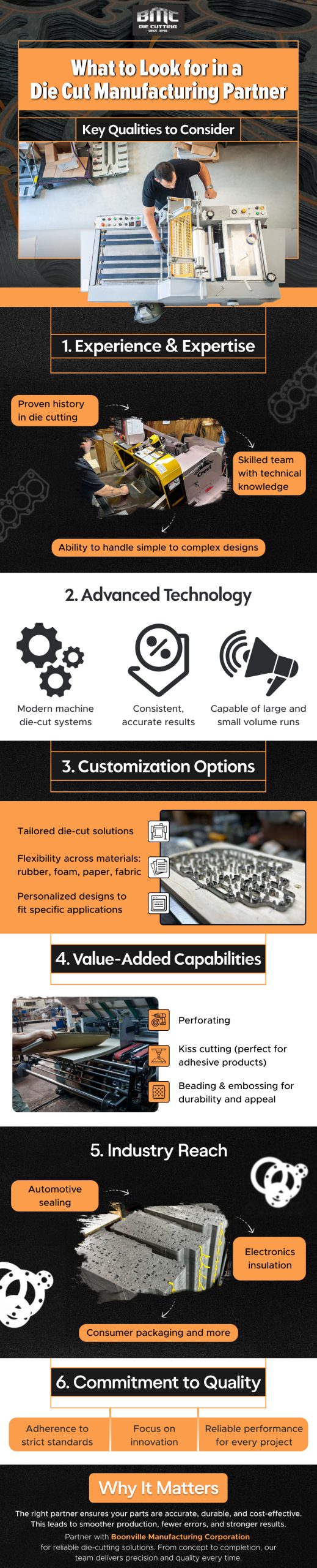https://www.boonvillemfg.com/die-cutting – Choosing the right die-cut manufacturing partner is key to achieving precision, consistency, and efficiency. Look for a company with proven expertise, advanced technology, and a commitment to quality. Boonville Manufacturing Corporation offers customized die-cutting solutions with value-added capabilities like perforating, kiss cutting, and embossing. Serving industries from automotive to electronics, Boonville ensures accuracy and durability across every project. From concept to completion, their skilled team delivers reliable, cost-effective results tailored to your material and design requirements.