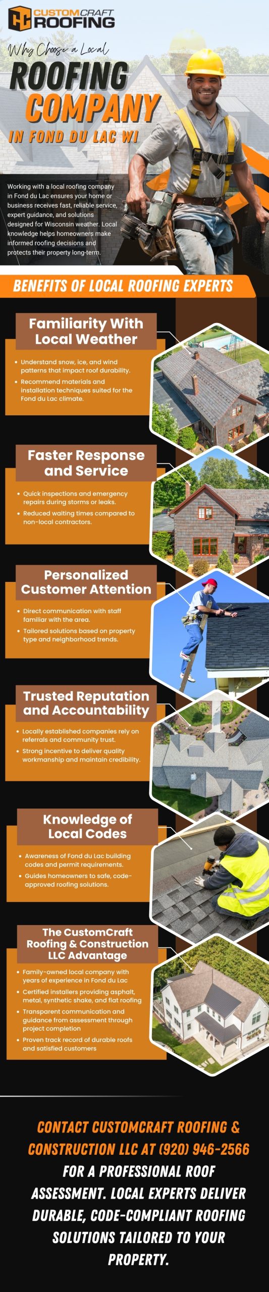 https://customcraftroofing.com/roofing-contractor-fond-du-lac-wi/ Hiring a local roofing company in Fond du Lac, WI ensures faster service, expert knowledge of Wisconsin weather, and personalized solutions. Local contractors understand snow, ice, and wind challenges, recommend suitable materials, and provide reliable, code-compliant installations. With strong community ties and accountability, they deliver trusted workmanship and long-term roofing protection.